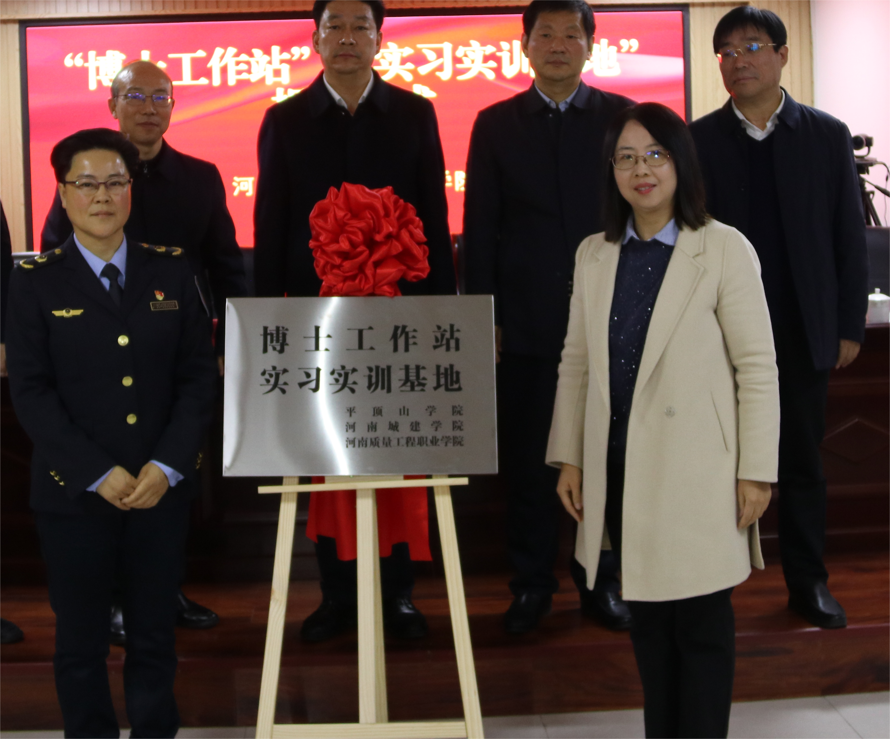 化学与环境工程公司党委书记曹萍与宝丰县市场监督管理局党组书记、局长王晓丽共同为“博士工作站”、“实习实训基地”揭牌。