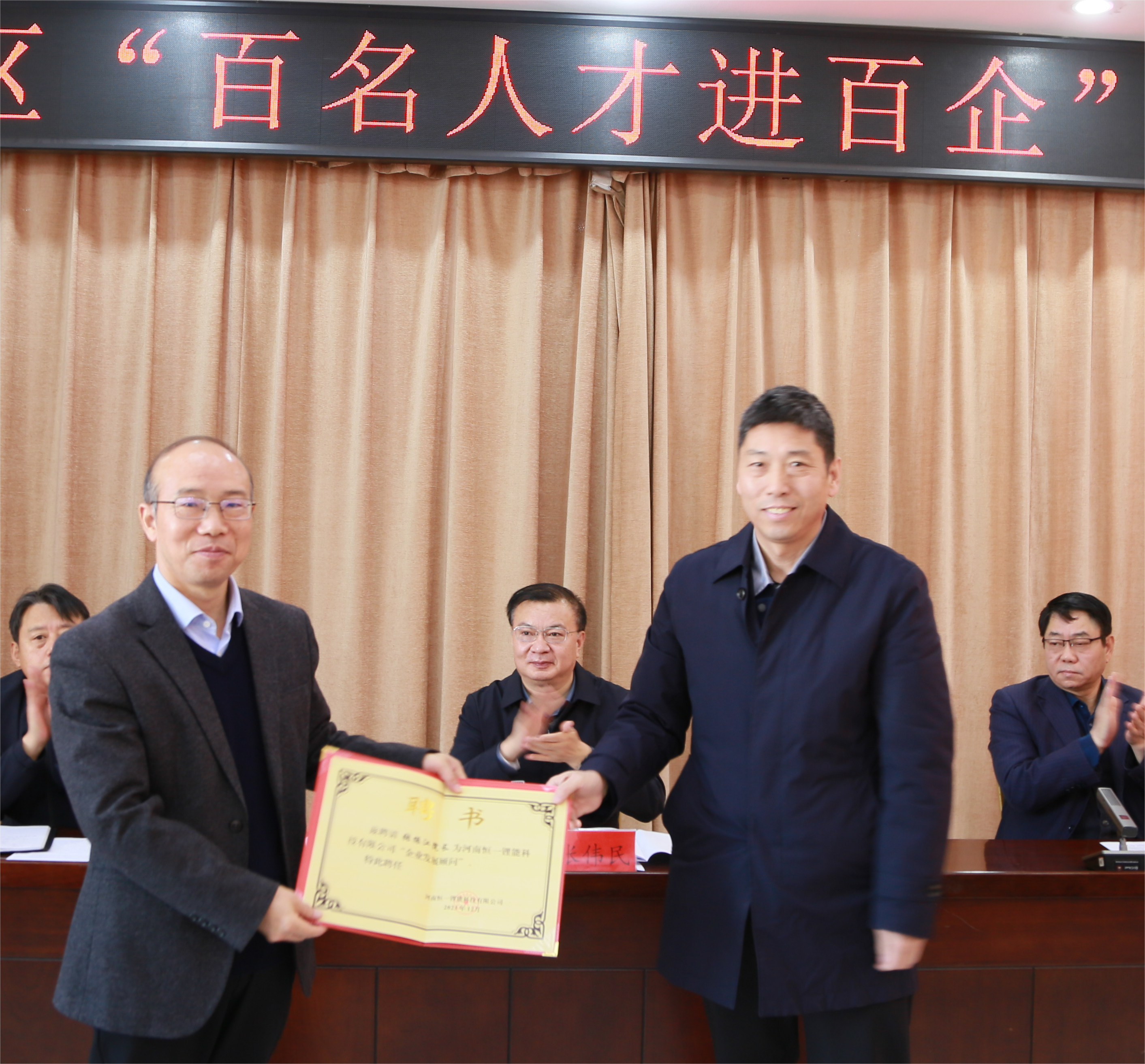张振江、贺杰等作为“百名人才进百企”首批助企代表发言,阶段性的总结经验、展示成果、共话未来。会上,河南恒一锂能科技有限公司向我司经理张振江颁发“企业发展顾问”聘书。