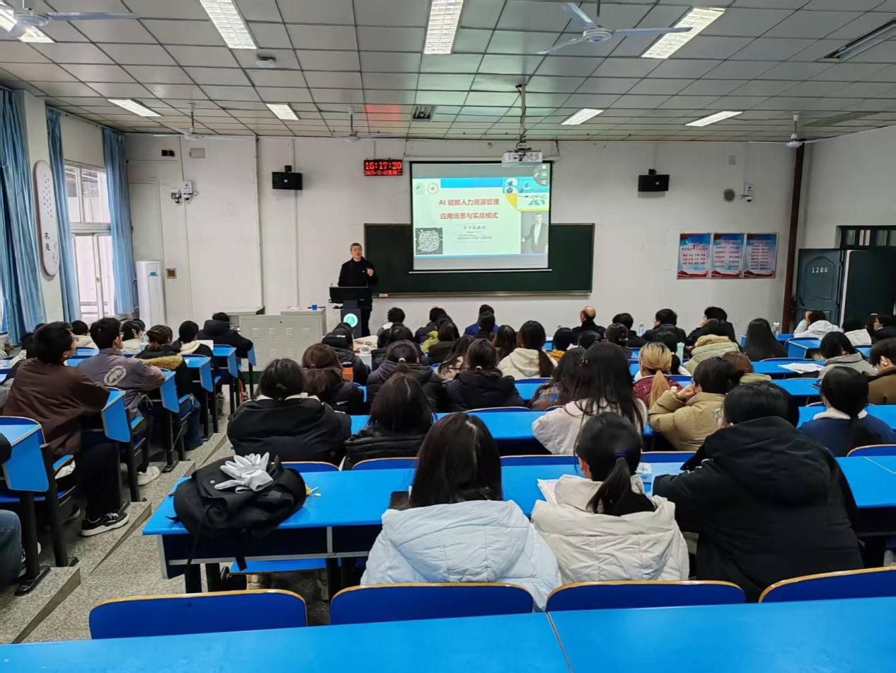 讲座伊始,李中斌围绕“AI赋能时代的人力资源管理动态”展开分享。他指出,随着人工智能技术的深度渗透,人力资源管理正从传统的“事务性处理”向“智能化决策”转型。AI技术不仅提升了招聘、培训、绩效考核等环节的效率,更推动了人才管理理念的革新,从“经验驱动”转向“数据驱动”。李教授强调,未来的HR需既能运用AI工具,又能把握人才的个性化需求。