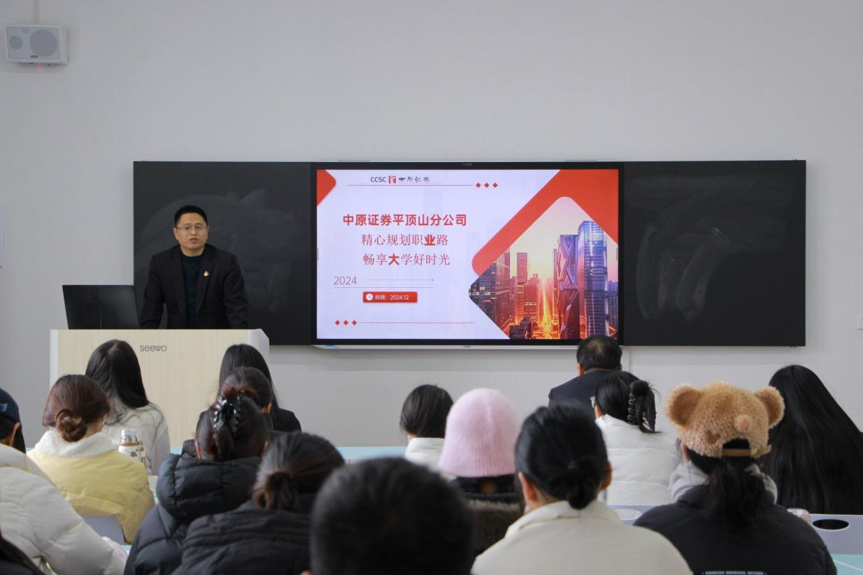 为进一步拓宽我司员工就业渠道,让员工洞悉企业用人风向,开户送58体验金官网于12月5日下午RC312实训室举办中原证券股份有限公司2025届专场宣讲会。经理张振江、副经理贺杰、中原证券股份有限公司平顶山分公司副总经理郑文朝、零售部刘法全出席会议,2025届毕业生通过线下和线上渠道参加会议,会议由团委副书记王哲主持。