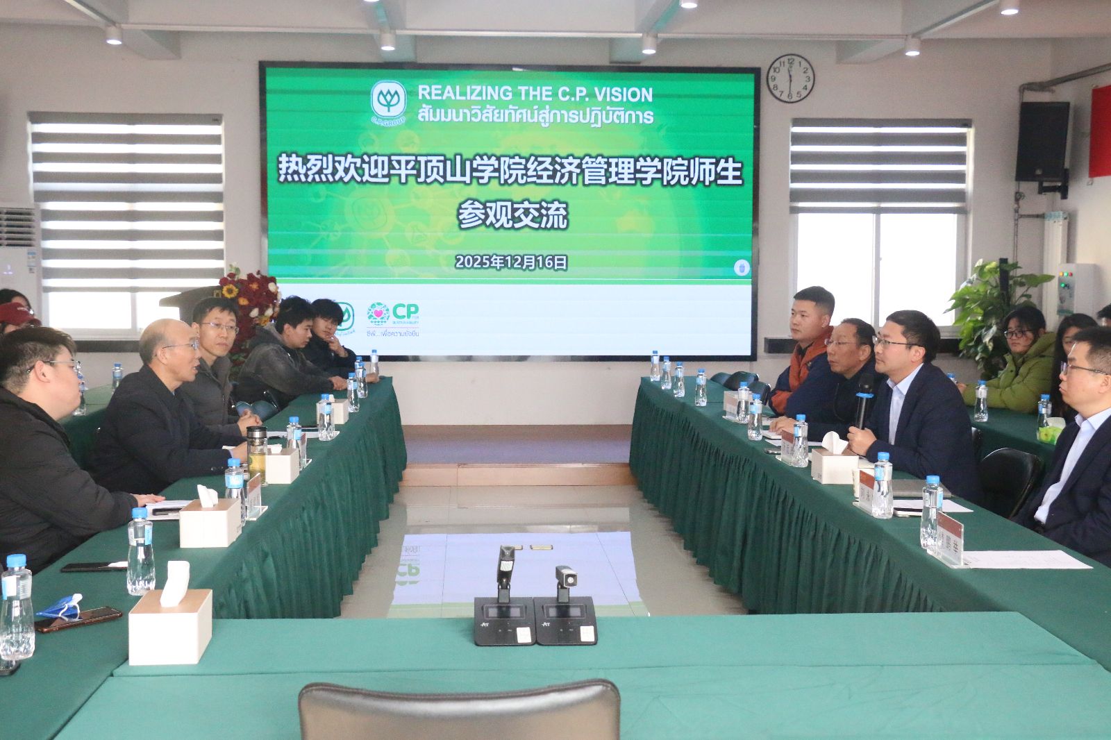 活动期间,师生通过观看企业宣传片、聆听负责人讲解,系统了解了公司的发展历程与业务布局。随后,张振江与平顶山正大有限公司总经理汤远政围绕校企合作展开洽谈,张振江结合学院“产教融合、协同育人”理念,提议以此次活动为契机,深化实习实训、就业指导、人才共育等领域合作,推动教育资源适配企业需求;汤远政对此表示认同,期待与学院进一步推进协同育人。